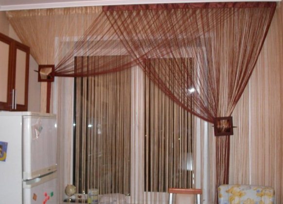 창 개구부의 설계 외에도, 실내 문 대신 커튼 - 실이 사용될 수 있으며, 이는 작은 방이나 아파트에서 특히 중요합니다. 스레드 커튼은 동양 인테리어가있는 넓은 거실에서 사용할 수 있습니다.